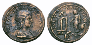 Solidifying the idea of Dido also being regarded as a builder and not a frenzied, jilted lover is the portrayal of her on coins as overseeing the building of Carthage. The city of Tyre, whence Dido sailed to Africa, minted coins with this and similar iconography. The use of this portrayal appears during the Emesan and Severan dynasty, and the earliest coins feature Heliogabalus and his grandmother Julia Maesa. Julia Maesa is the key, since she, and her sister Julia Domna, were, like Dido, local girls who made good, and via Leptis Magna, the hometown of Septimius Severus, an African city like Carthage, has founded an empire. Syria was the arena for the struggle between the usurper Macrinus and Heliogabalus, and the minting asserted loyalty to the winner, as well as underlining their special bond. This reverse of Dido is used for one of Heliogabalus wives, and later emperors, possibly to remind of Tyre’s dynastic claims and clout. Using Dido the builder to highlight one’s connection to and ingratiate oneself with the Emesan family demonstrates that Dido the chaste founder was a well-known and understood entity. The prevalence and legibility of this image of Dido as a builder in is illustrated, and also why the image ceased being used on coins.